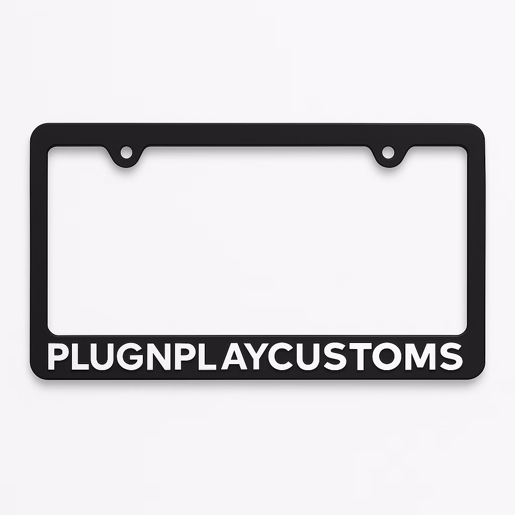This PLUGNPLAYCUSTOMS license plate frame is a downloadable STL file made for 3D printing. It fits all U.S.-standard license plates (12” x 6”) and includes raised PLUGNPLAYCUSTOMS lettering for a clean, bold look.