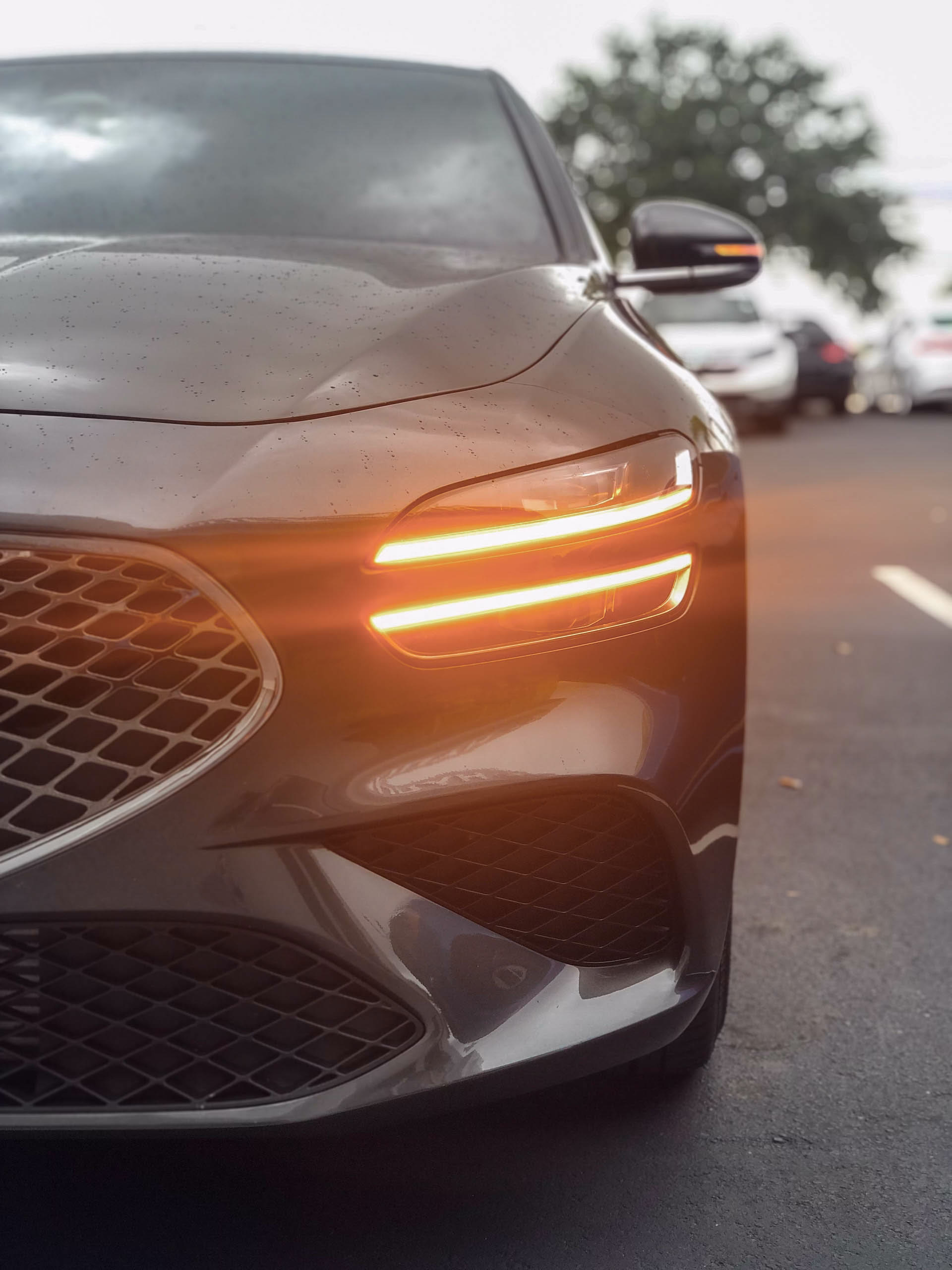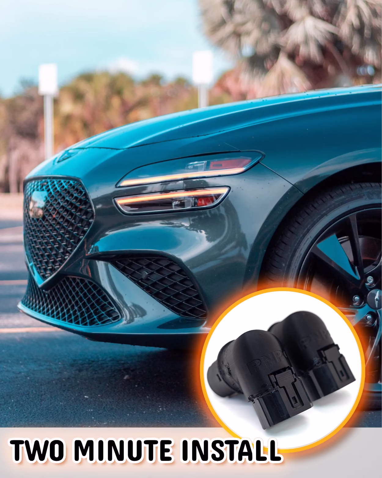 This Genesis G70 amber DRL module gives your 2022 and newer Genesis G70 a clean amber daytime running light look without opening the headlights. The module plugs in between the factory headlight and the OEM wiring harness, so the install stays simple and fully reversible.